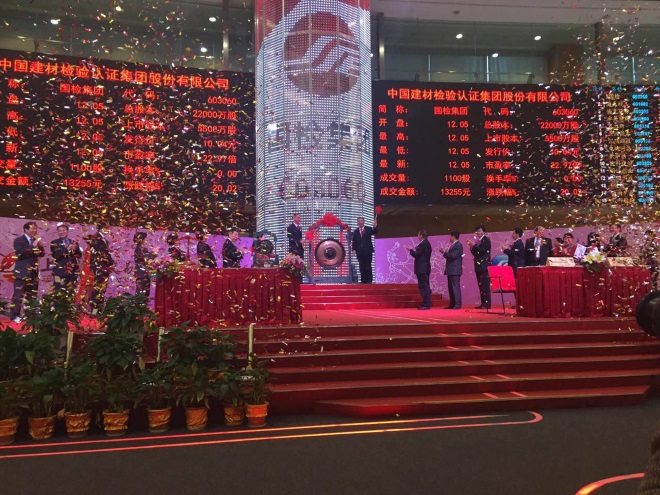 2016年11月9日,中國建材檢驗(yàn)認(rèn)證集團(tuán)股份有限公司(以下簡(jiǎn)稱“國檢集團(tuán)”)在上海證券交易所成功掛牌上市。中國建筑材料聯(lián)合會(huì)會(huì)長(zhǎng)喬龍德,中國建材集團(tuán)有限公司董事長(zhǎng)宋志平,中國建材集團(tuán)有限公司副董事長(zhǎng)、中國建筑材料科學(xué)研究總院院長(zhǎng)、國檢集團(tuán)董事長(zhǎng)姚燕,上海證券交易所副理事長(zhǎng)張冬科,安信證券副總裁秦沖,中國建材集團(tuán)有限公司外部董事趙吉斌、沙鳴、張燕玲,中國標(biāo)準(zhǔn)化研究院院長(zhǎng)馬林聰,國家質(zhì)量監(jiān)督檢驗(yàn)檢疫總局原總工程師、國際質(zhì)量科學(xué)院院士劉卓慧,中國分析測(cè)試協(xié)會(huì)副會(huì)長(zhǎng)兼秘書長(zhǎng)張渝英等出席掛牌儀式。期間宋志平、姚燕、秦沖分別致辭,姚燕與張冬科分別代表國檢集團(tuán)和上海證券交易所簽訂《上市協(xié)定書》并互贈(zèng)上市紀(jì)念品。國檢集團(tuán)在A股市場(chǎng)正式亮相。